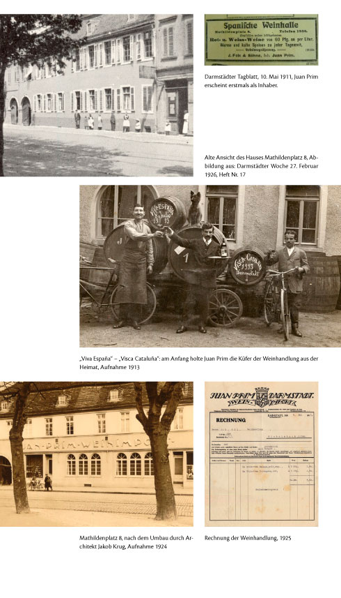 In der "Darmstädter Woche", einer vom Verkehrsverein herausgegebenen Werbezeitschrift, erschien am 27. Februar 1926 ein Artikel über "Um- und Neubauten in Darmstadt". Darin geht der Autor auch auf den Umbau der Spanischen Weinhalle von Juan Prim am Mathildenplatz ein und gibt Informationen über die Entstehung des Gebäudes und seine ehemaligen Besitzer.